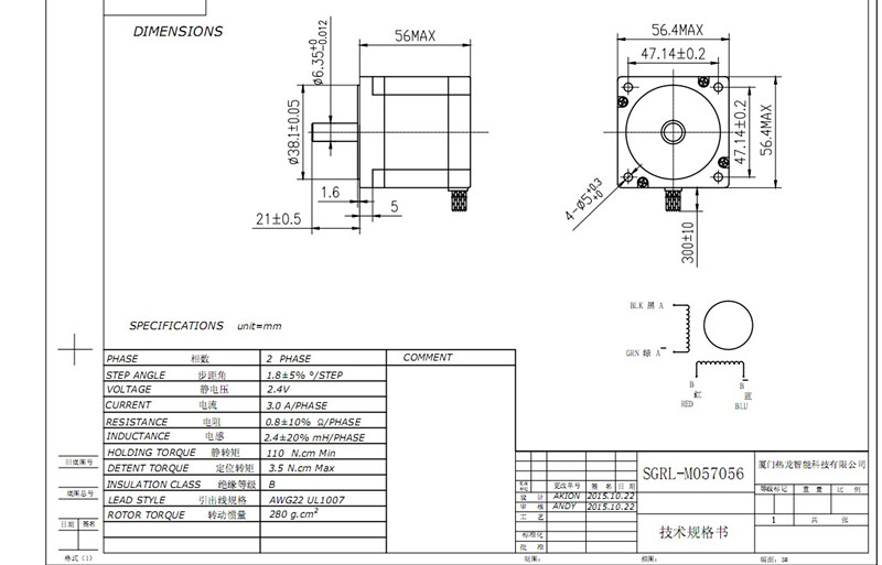 57步進電機 56mm, 1.1N.m /3A/0.035牛